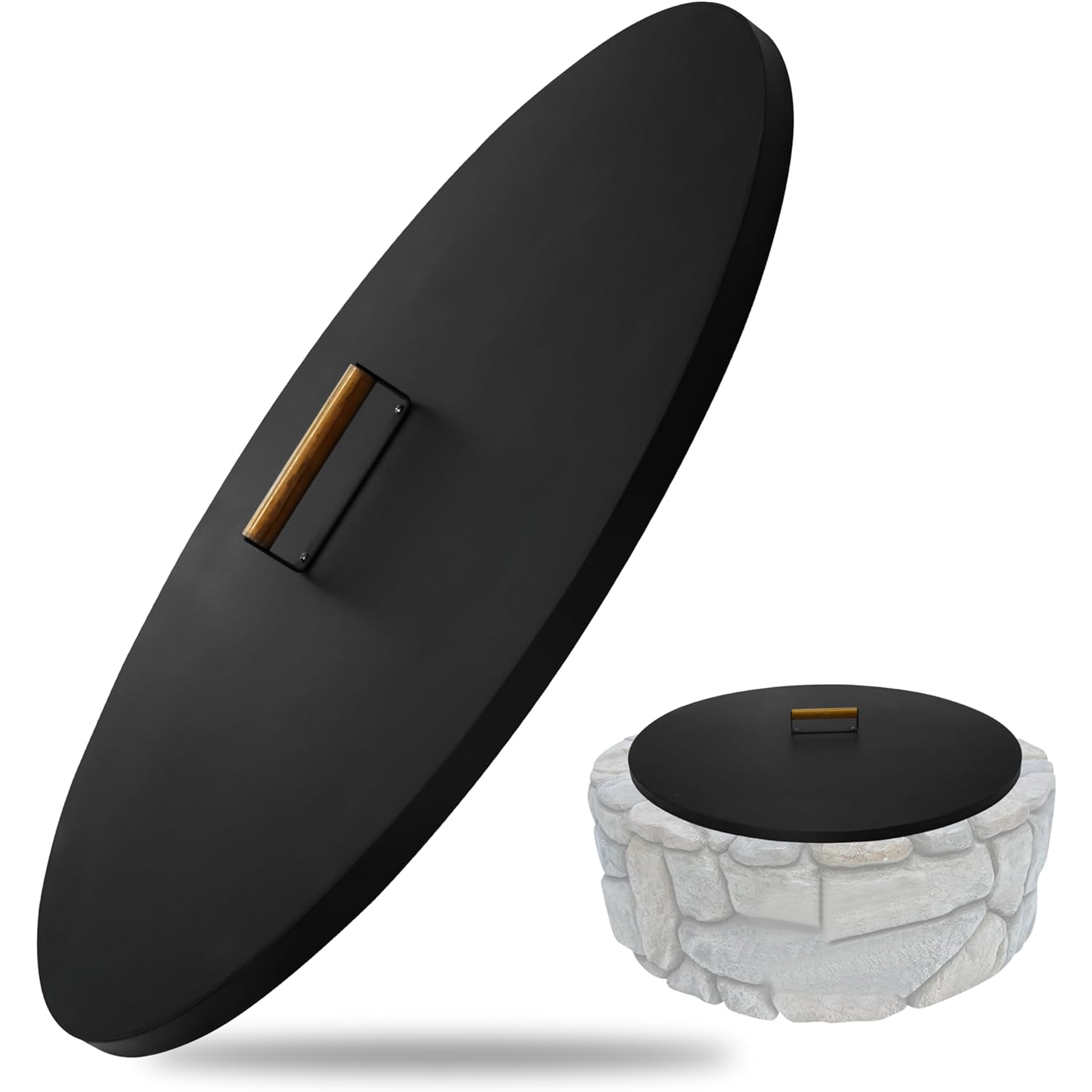 Simond Store – Snuffer Lid 36″ – 2MM Powder Carbon Steel Fire Pit Cover Round with 1 Ergonomic Wooden Handle – Compatible for Firepit Inside Dia Up to 34″