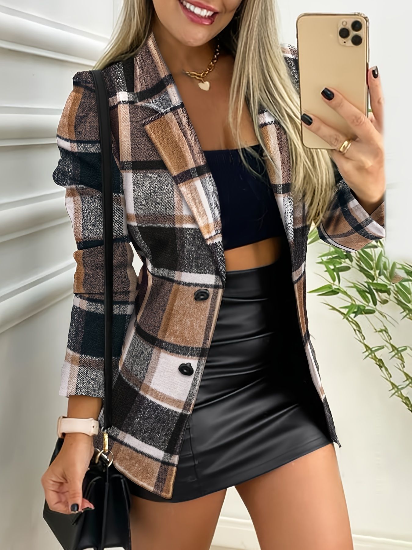 Plaid Button Down Long Sleeve Lapel Coat; Fashion Winter Blazer