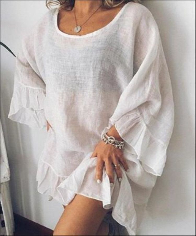 summer new women's casual wild solid color shirt stitching ruffled sleeves loose long T-shirt
