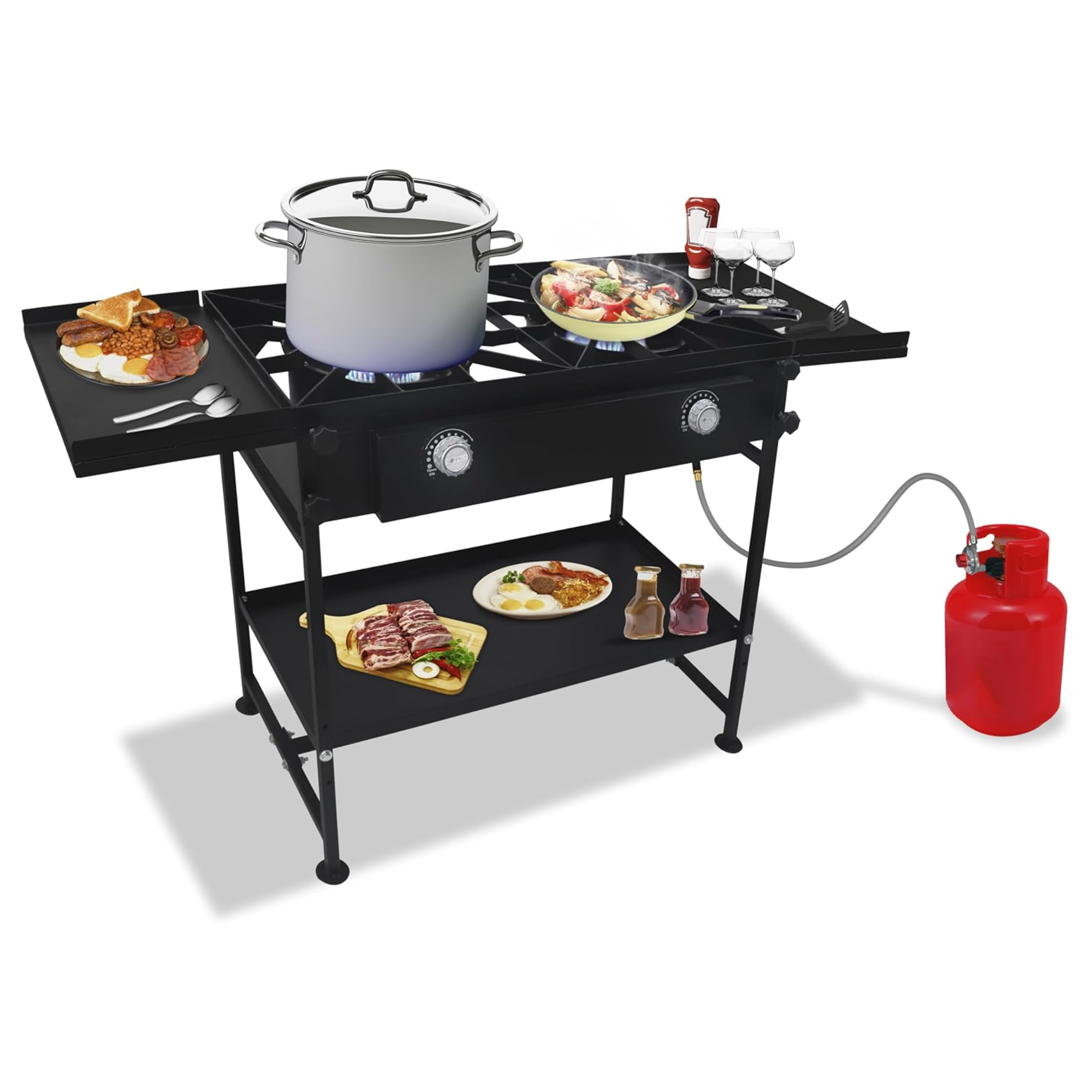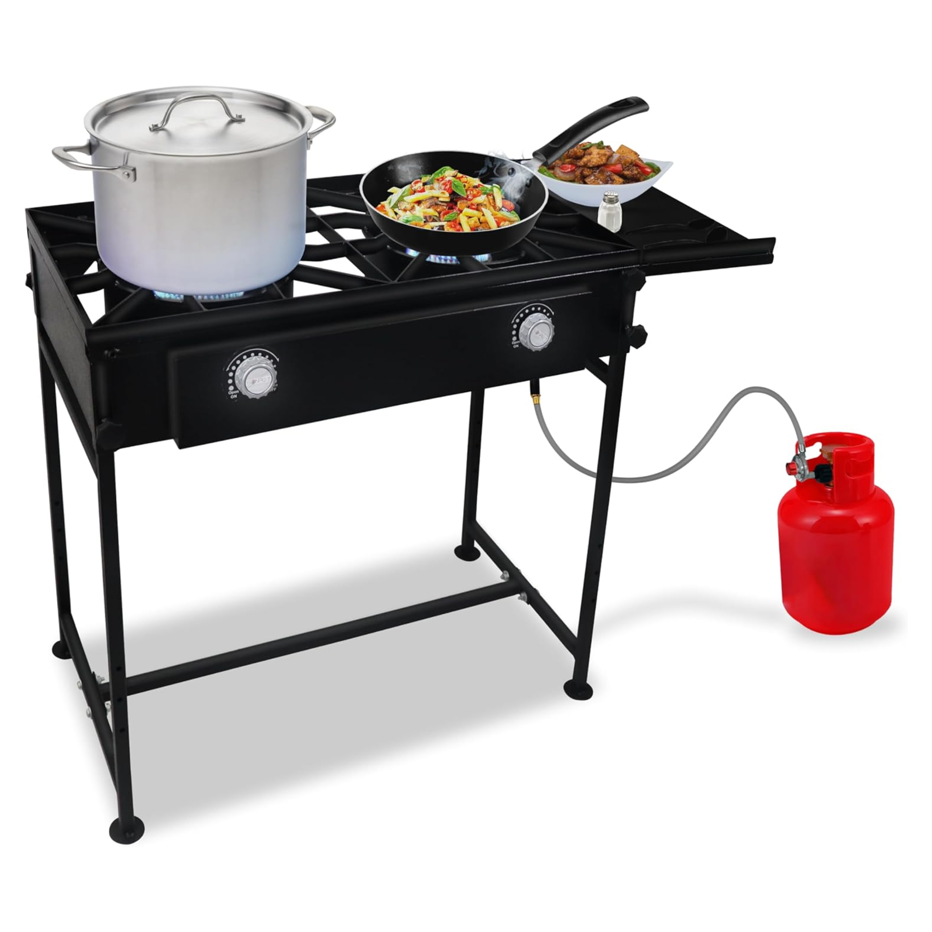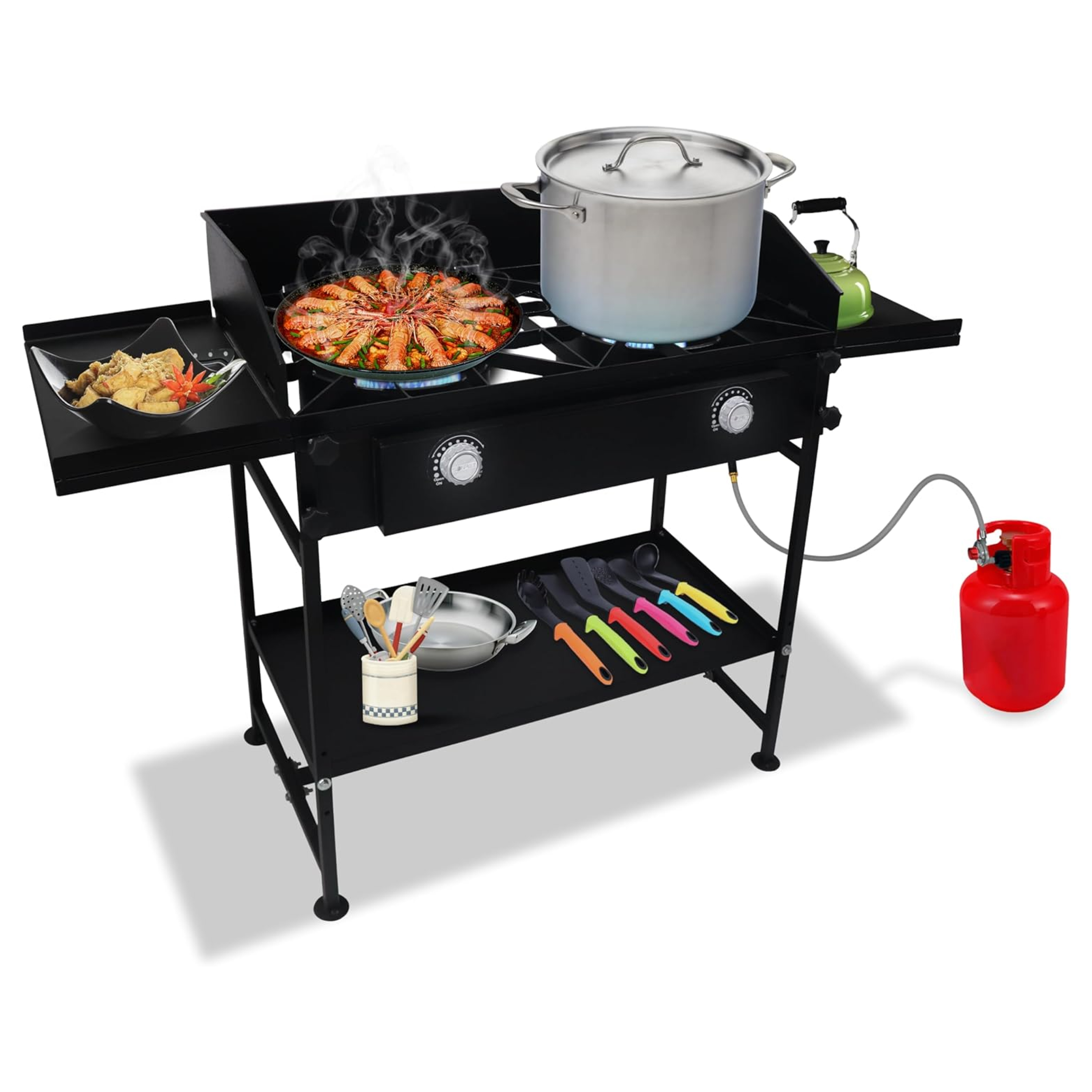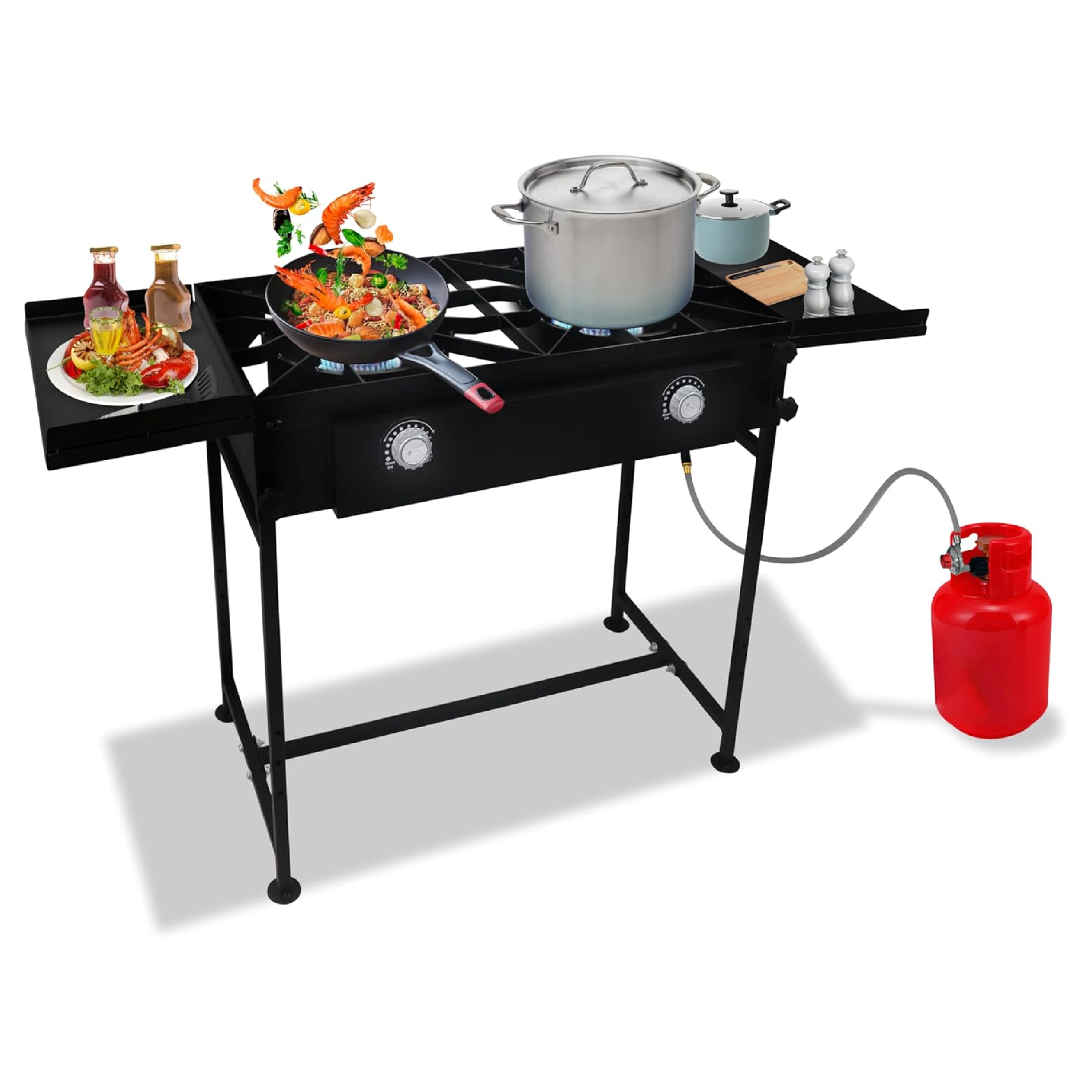2 burner propane stove Gas Burner -150,000 High btu Propane Burner Camping Stove W/Side & Bottom Shelf & Wind Panel Double burner Propane Stove outdoor – W/CSA-approved 0-20 PSI regulator & hose.
