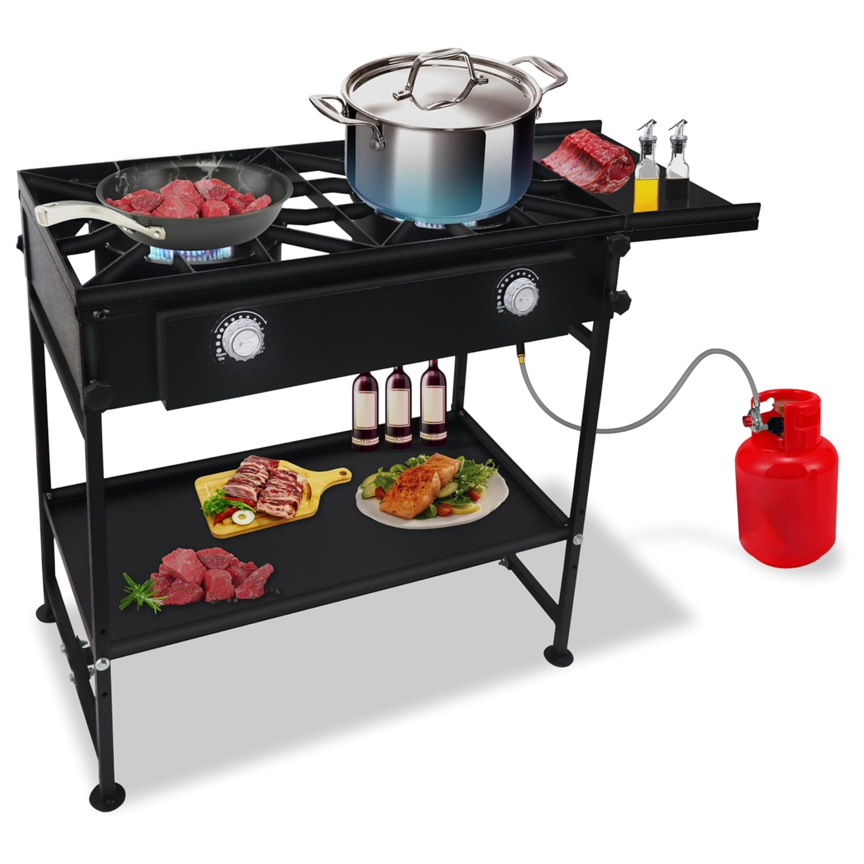 2 burner propane stove Gas burner -150,000 High btu Propane Burner Camping Stove W/Detachable legs, Side & Bottom Shelf Double burner Propane Stove outdoor – W/CSA-approved 0-20 PSI regulator & hose.